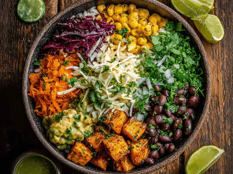 - Ingredients: Brown rice, black beans, corn, bell peppers, salsa, avocado.
