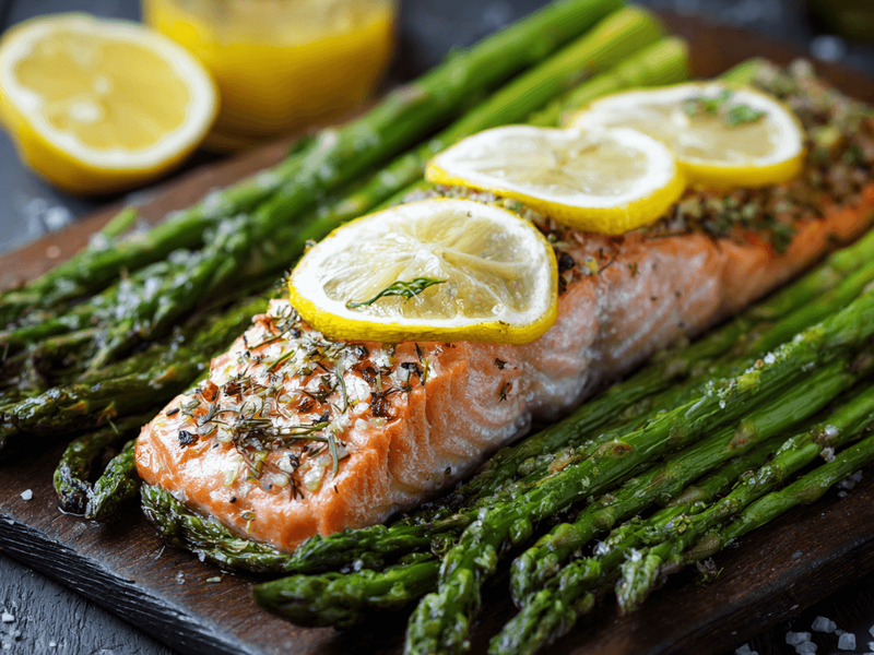 - Ingredients: Salmon fillets, asparagus, olive oil, garlic powder, lemon.