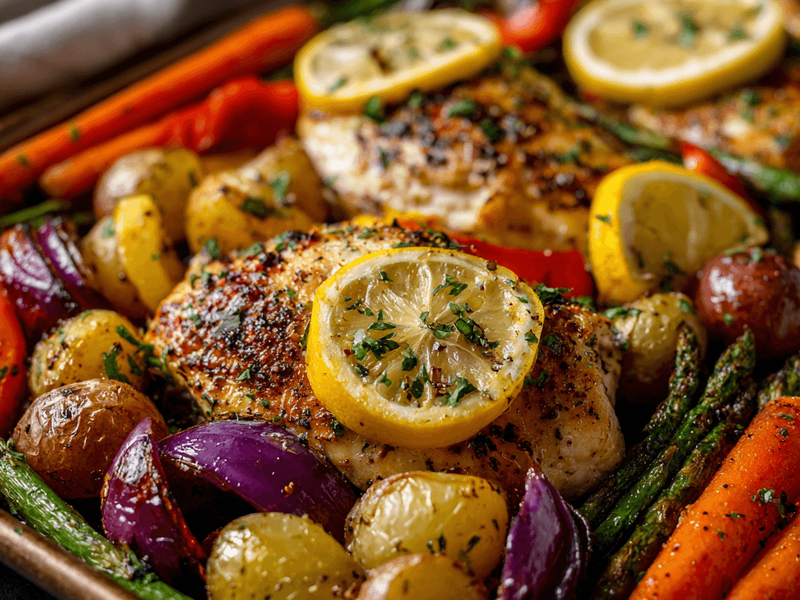- Instructions: Toss chicken and veggies with olive oil, lemon, and garlicroast at 400°F for 25 mins.