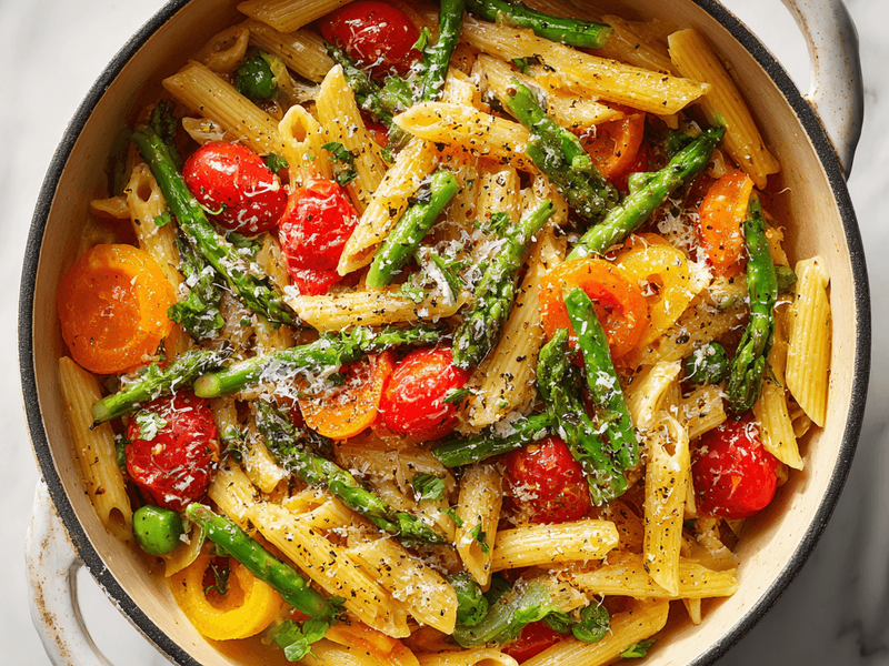 - Ingredients: Pasta, zucchini, bell peppers, cherry tomatoes, olive oil, garlic.