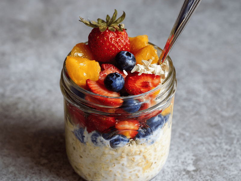 - Ingredients: Rolled oats, milk (dairy or plant), chia seeds, honey, berries.