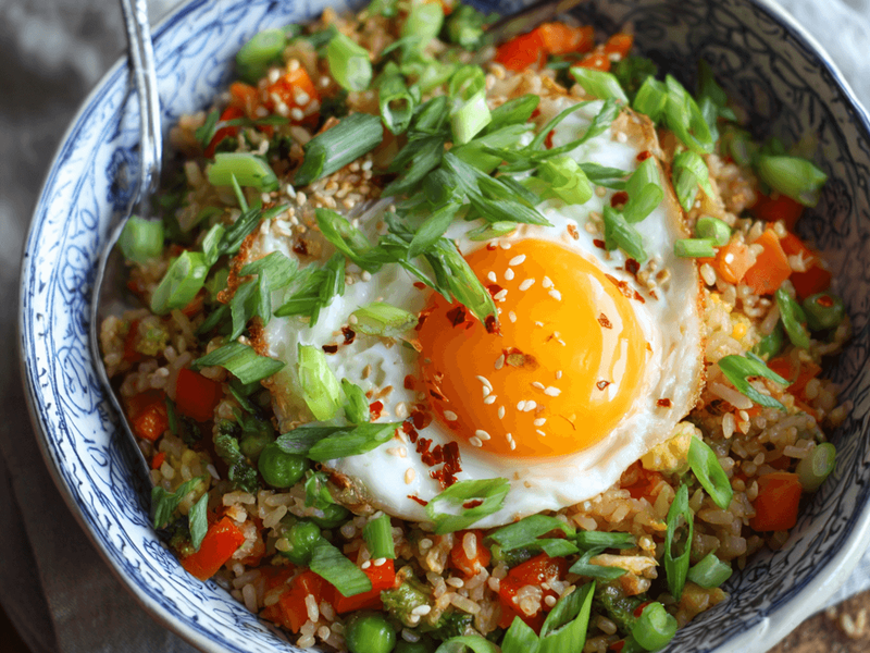 - Instructions: Scramble eggsadd veggies and ricestir-fry with soy sauce.