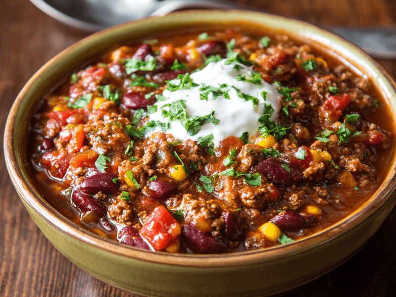 - Ingredients: Ground beef or beans, diced tomatoes, kidney beans, chili powder, onion.