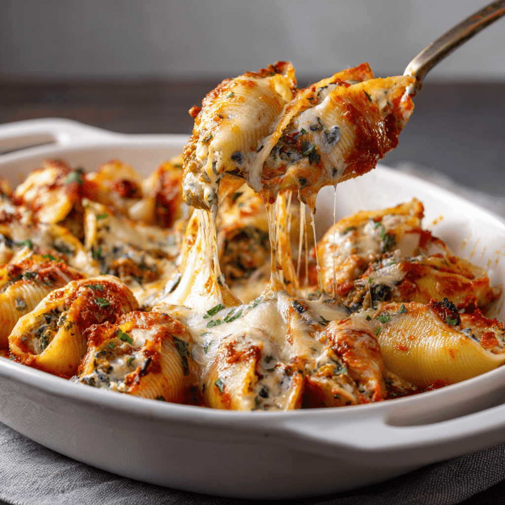 Description: Pasta shells filled with spinach and ricotta, baked in tomato sauce.