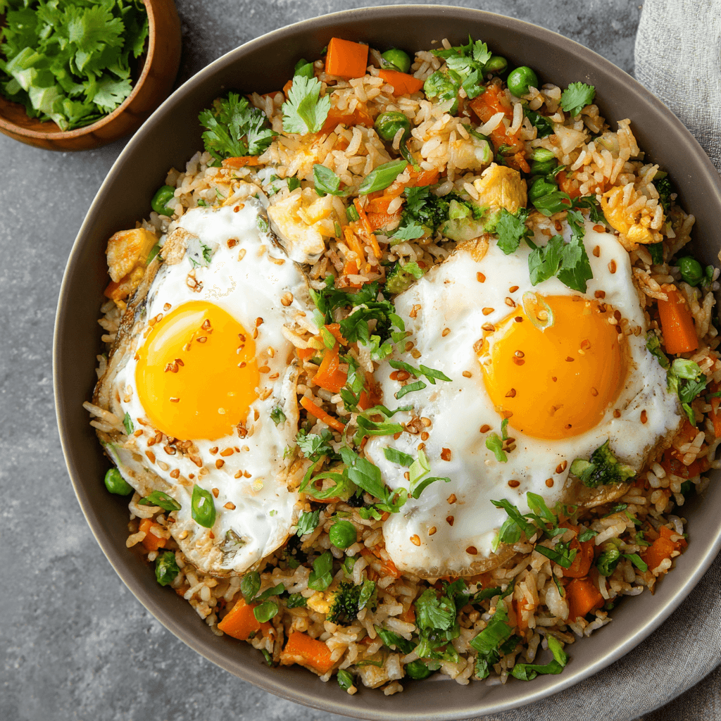 Directions: Scramble eggs, set aside. Stir-fry veggies, add rice, soy sauce, and mix in eggs.