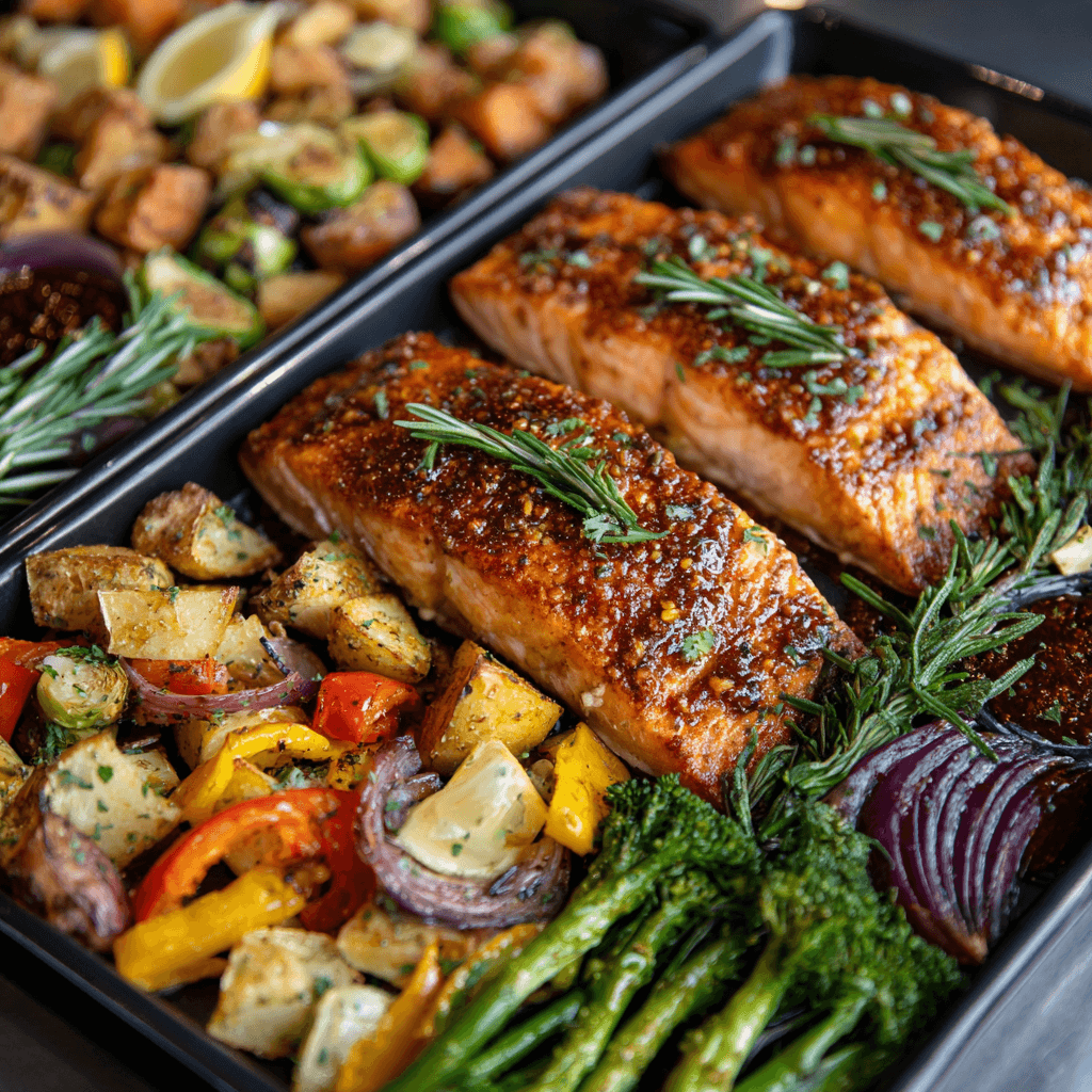 Directions: Place salmon and chopped veggies on a tray, drizzle with olive oil and lemon. Roast at 200°C (400°F) for 20 minutes.