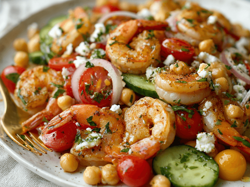 2. Toss shrimp, chickpeas, cucumber, oil, and lemon juice.