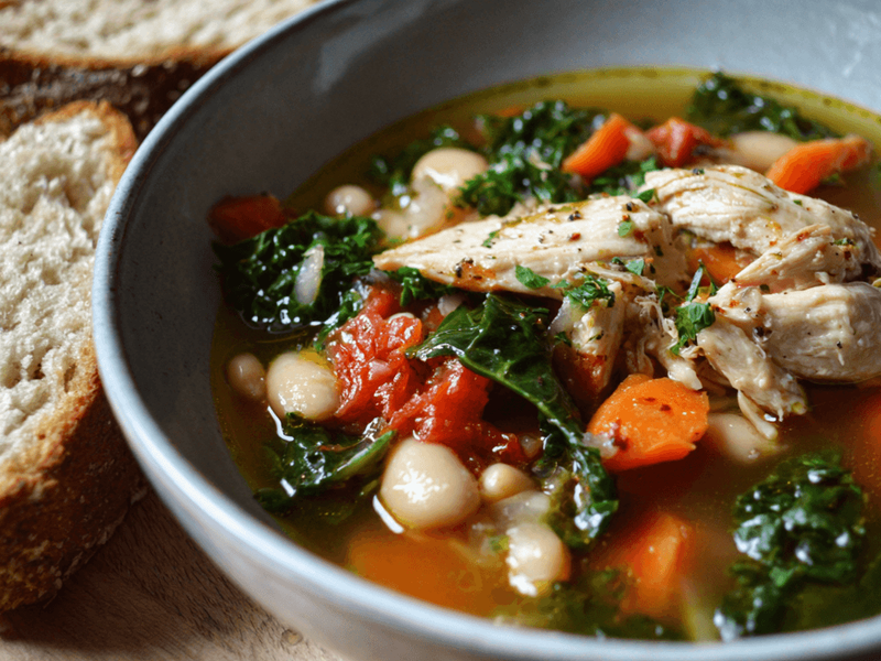 2. Add broth, beans, chicken, and thymesimmer until flavors blend.