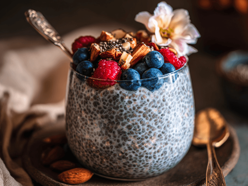 Ingredients: 3 tbsp chia seeds, 1 cup almond milk, 1 tbsp maple syrup, fruit toppings.