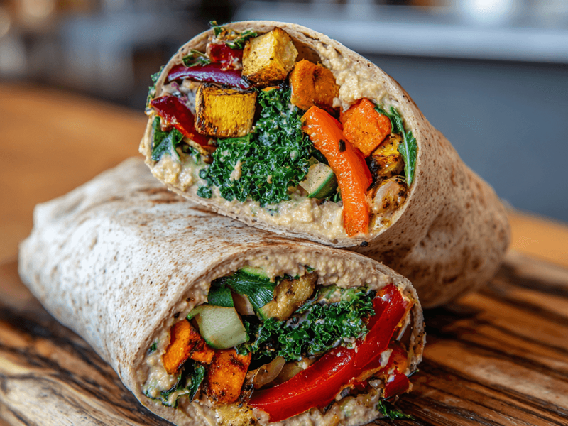 Ingredients: Whole wheat tortilla, ½ cup roasted veggies, 3 tbsp hummus, spinach.