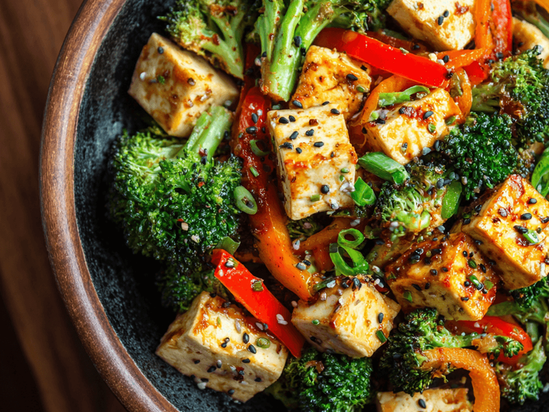 Ingredients: 250g tofu, 2 cups broccoli, 1 bell pepper, 2 tbsp soy sauce, 1 tsp sesame oil.