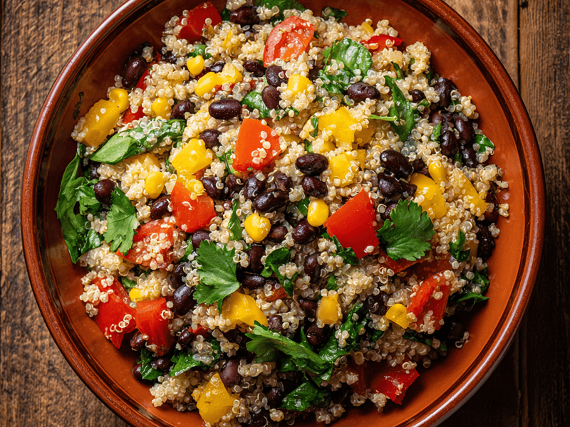 Ingredients: 1 cup cooked quinoa, 1 can black beans, 1 red bell pepper, 1 tbsp lime juice, cilantro.