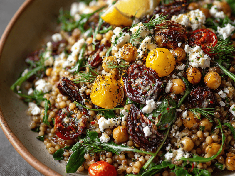 Ingredients: Farro or couscous, cherry tomatoes, cucumber, olives, parsley, olive oil, lemon juice.