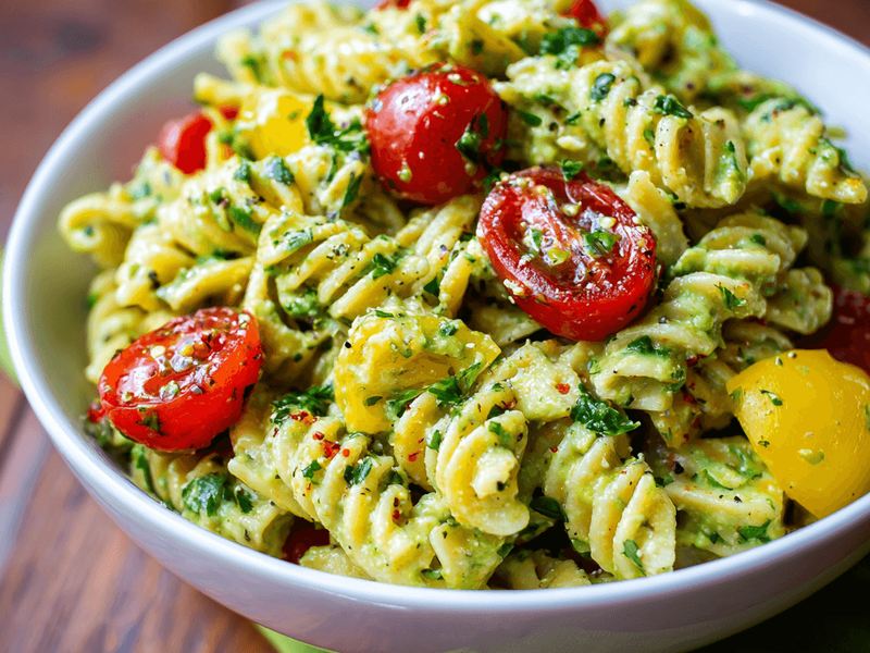 Description: A refreshing pasta dish with creamy avocado dressing and crunchy veggies.