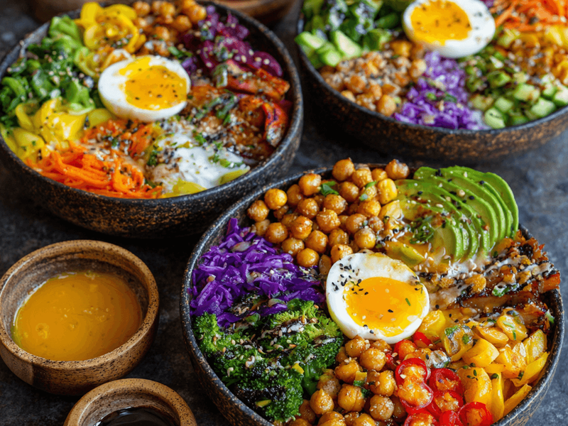 Description: A colorful bowl of grains, beans, and roasted veggies with tahini dressing.
