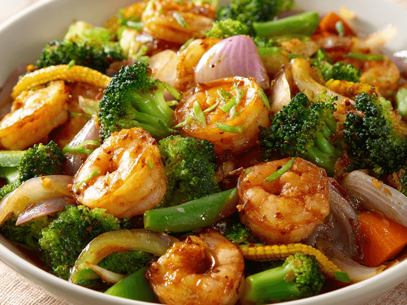 Ingredients: Shrimp, broccoli, snap peas, garlic, soy sauce, sesame oil, rice noodles.