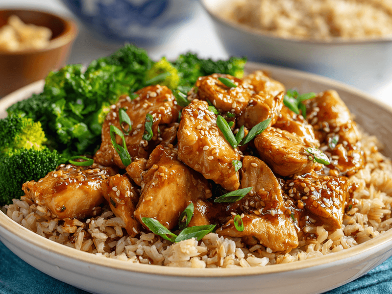 Ingredients: Chicken breasts, honey, soy sauce, garlic, sesame seeds, brown rice, broccoli.