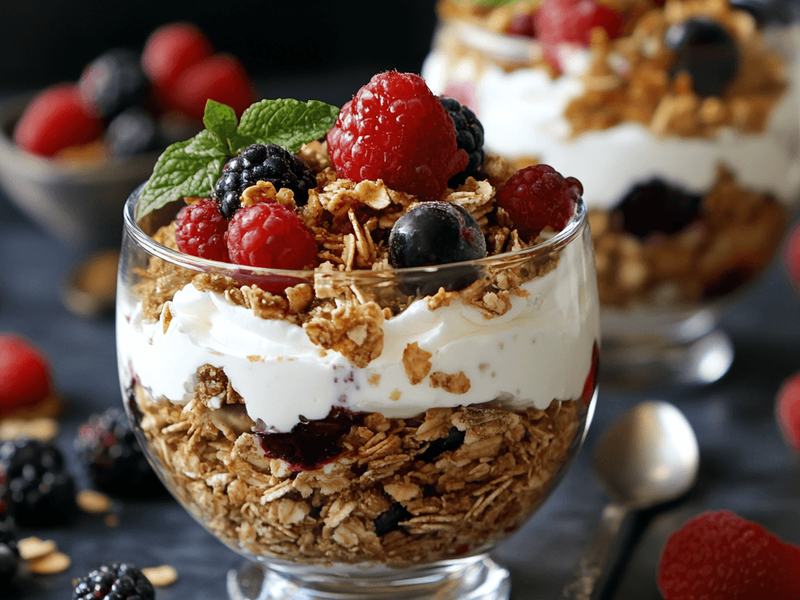 Creamy Greek yogurt layered with fresh berries and granola makes for a protein-rich, refreshing dessert that doubles as a healthy breakfast.