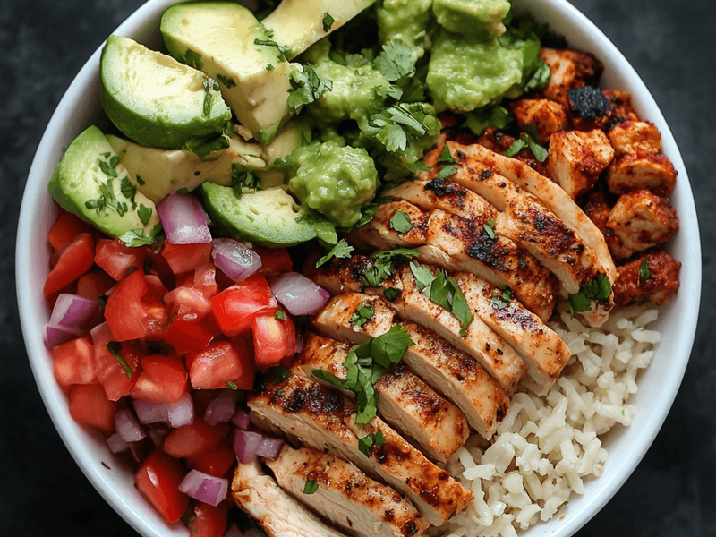 This flavorful bowl combines chicken, rice, beans, and salsa for a filling and customizable lunch. Add guacamole for an extra treat!