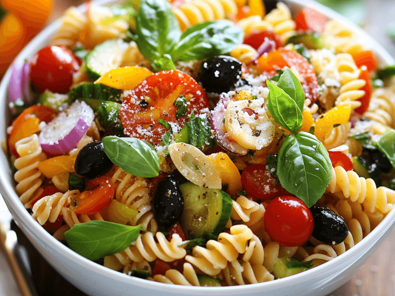 A light and tangy pasta salad with cherry tomatoes, olives, and Italian dressing for a perfect lunch option.
