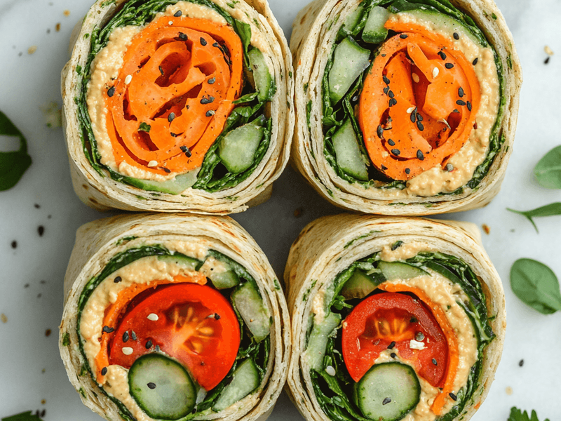 These colorful wraps are packed with fresh veggies and creamy hummus for a quick, refreshing meal.