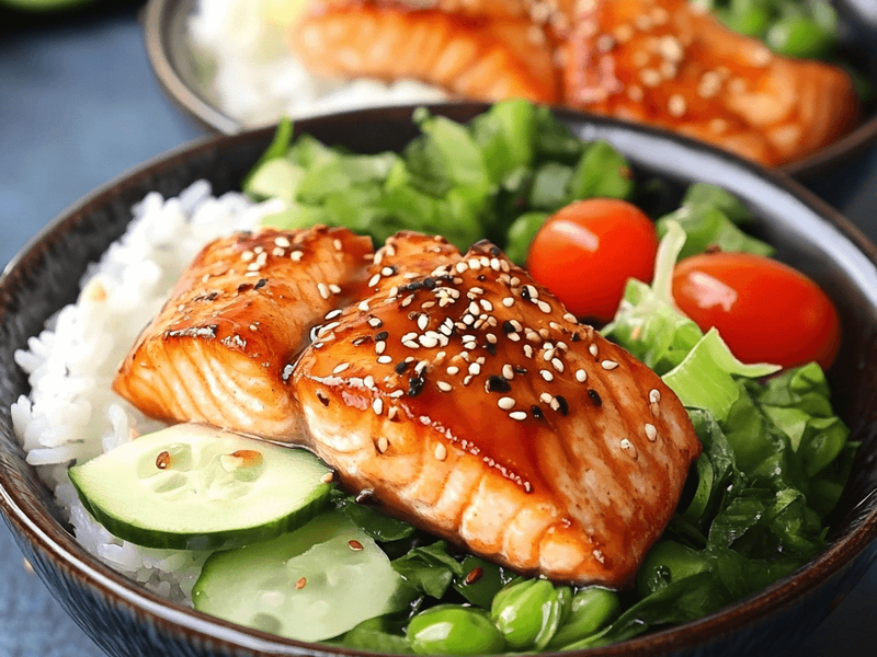 Sweet and savory teriyaki salmon paired with rice and steamed broccoli makes for a healthy, delicious lunch.