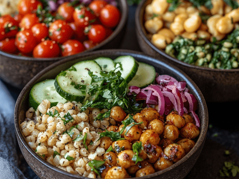 This bowl combines farro or quinoa with Mediterranean flavors like feta, olives, and cucumber.