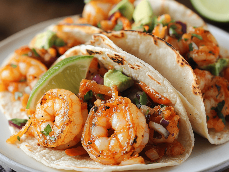 Kick up the flavor with these spicy shrimp tacos topped with crunchy slaw and a squeeze of lime.
