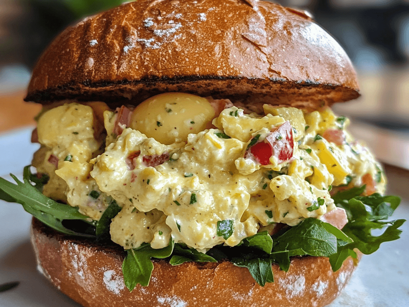 A creamy egg salad spread on whole grain bread makes a satisfying classic lunch.