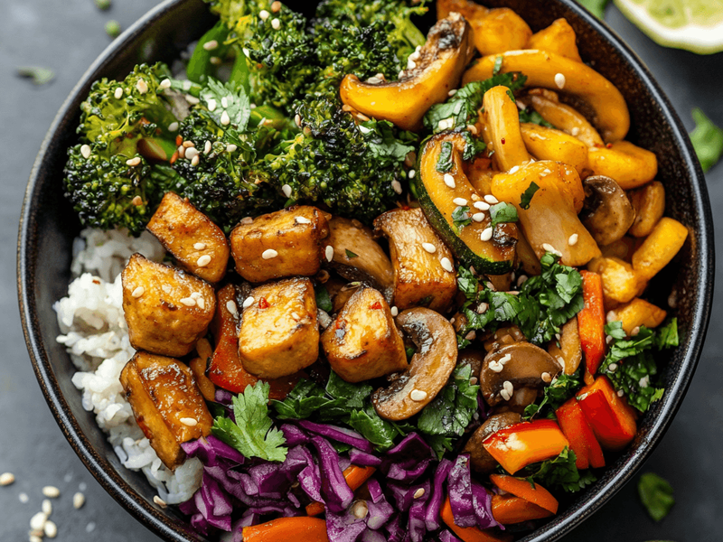 A quick stir-fry loaded with fresh vegetables and soy sauce over rice or noodles.