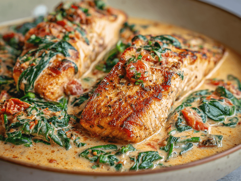 - Instructions: Sear salmon, set aside. Sauté garlic, tomatoes, spinach, and cream, then return salmon.
