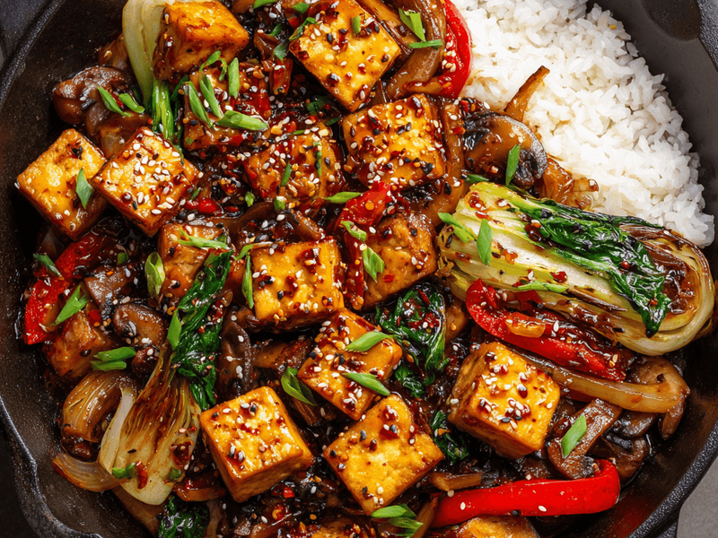 - Instructions: Pan-fry tofu until golden, add veggies and sauce, stir-fry.