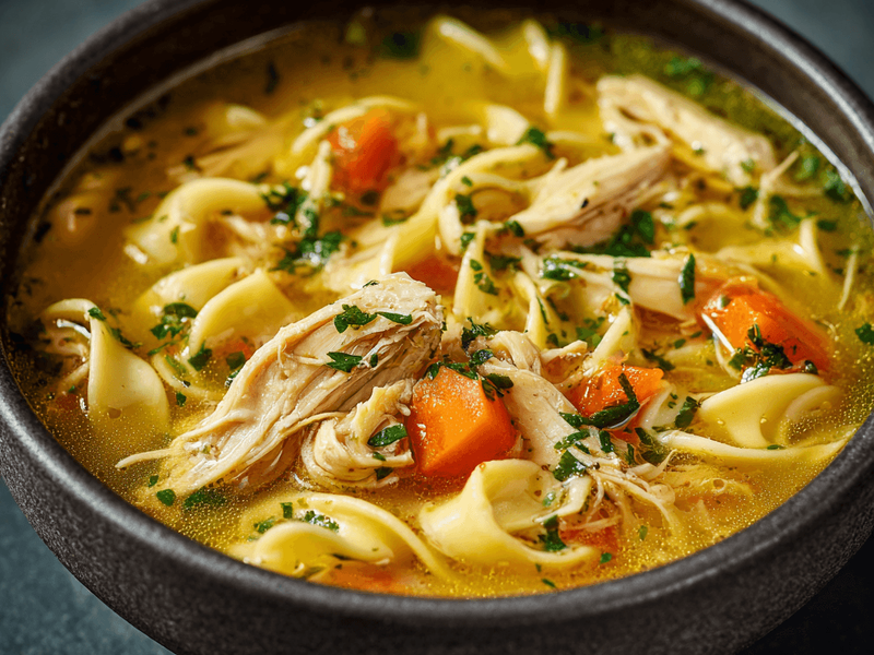 - Instructions: Simmer chicken and veggies in broth, shred chicken, add noodles.