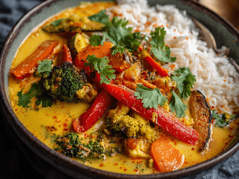- Ingredients: Mixed vegetables (carrots, peas, cauliflower), chickpeas, coconut milk, curry powder.