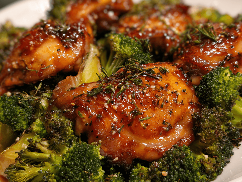 - Ingredients: Chicken thighs, garlic, honey, soy sauce, broccoli.
