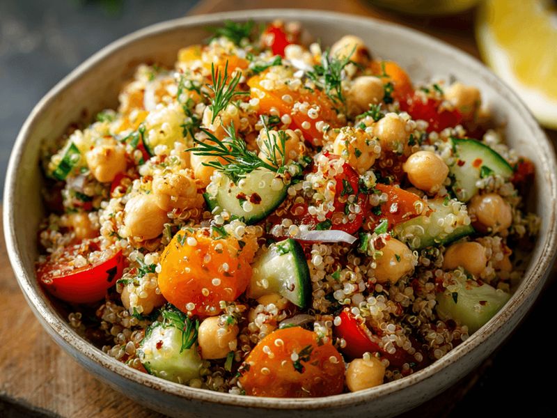 - Instructions: Cook quinoa, toss with veggies, chickpeas, and lemon dressing.
