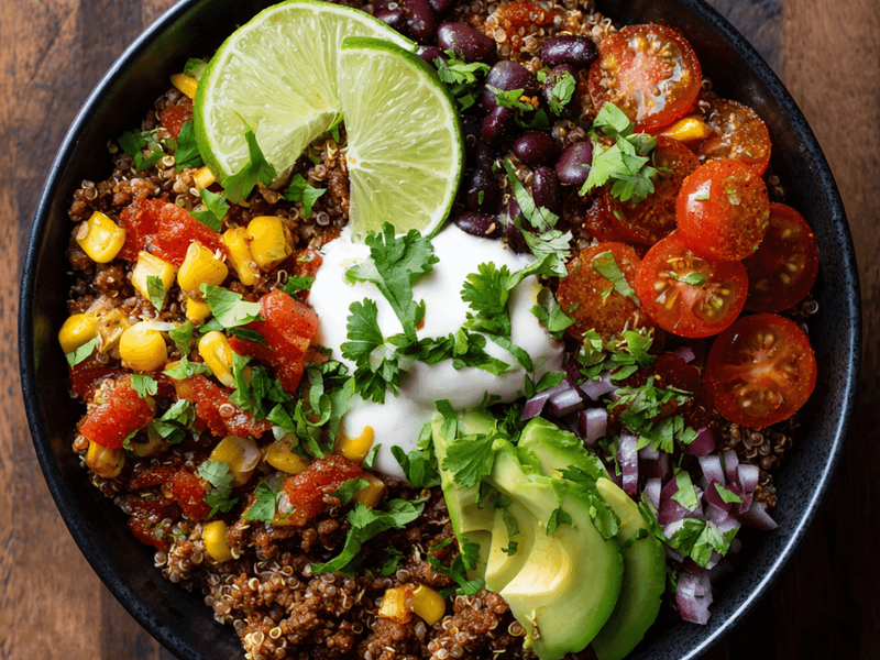 - Ingredients: Quinoa, black beans, corn, bell peppers, taco seasoning.