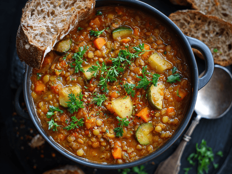 - Instructions: Sauté veggies, add lentils and broth, simmer until tender.