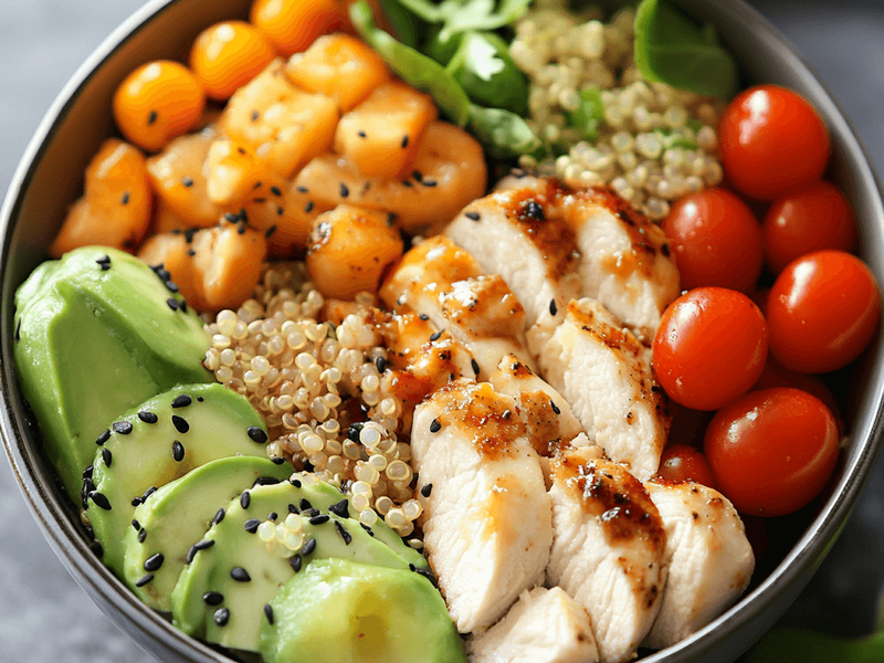 1. Combine quinoa, chicken, and veggies in a bowl.