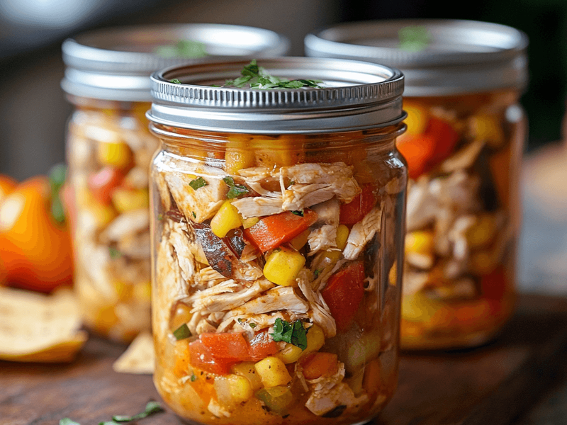 1. In a microwave-safe jar or container, layer all ingredients except chips.