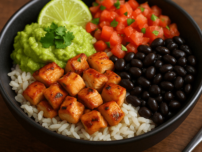 All the flavor of a burrito without the wrap. These bowls layer seasoned rice, black beans, corn, and shredded chicken for a quick lunch fix.