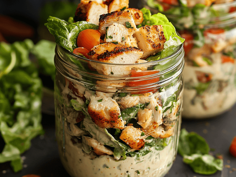 A layered salad in a jar with crisp romaine, parmesan, and rotisserie chicken. Keeps well and makes a perfect grab-and-go lunch.