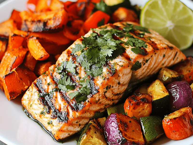 6.Cilantro Lime Grilled Salmon with Roasted Veggies