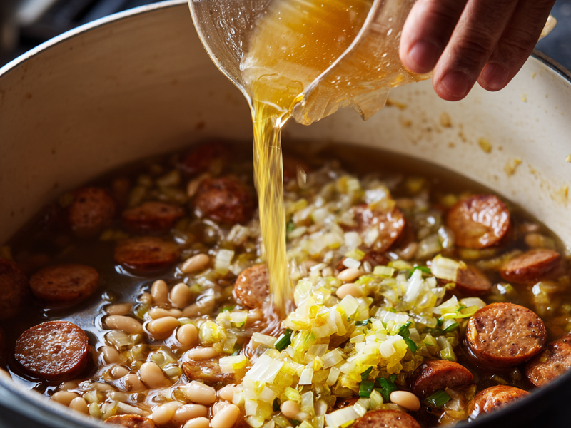 Step 3: Add broth, beans, and seasoning.