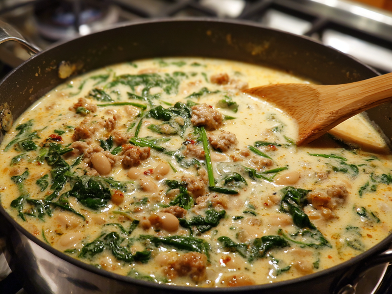 The soup starts by browning the sausage, which releases flavor into the pot. Onion and garlic build aroma, followed by broth and beans. After simmering, cream and spinach are added to finish the soup.