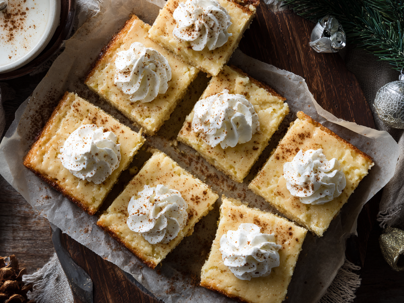 Eggnog desserts tend to be popular in December because they bring familiar seasonal flavors without requiring complicated steps. These cheesecake bars are especially appealing because they deliver the creaminess of traditional cheesecake with far less work. They are reliable, festive, and easy enough for beginners, which makes them a great go-to recipe for the holidays.