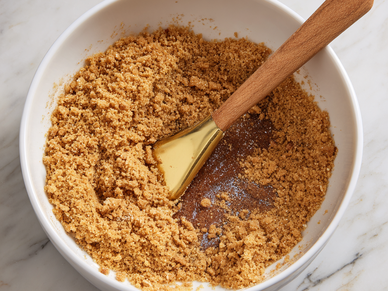 Step 2: In a medium bowl, mix the graham cracker crumbs, sugar, cinnamon, and melted butter. Stir until the crumbs look coated and the mixture resembles damp