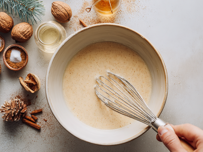 Step 6: Add the eggnog, vanilla, nutmeg, cinnamon, and a small pinch of salt. Mix just until combined. Over mixing can create air pockets and may cause cracks during baking.