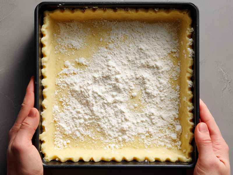 Step 3: Press the crust into the bottom of the pan. Bake for 8 minutes, then set the pan aside to cool slightly while you prepare the filling.
