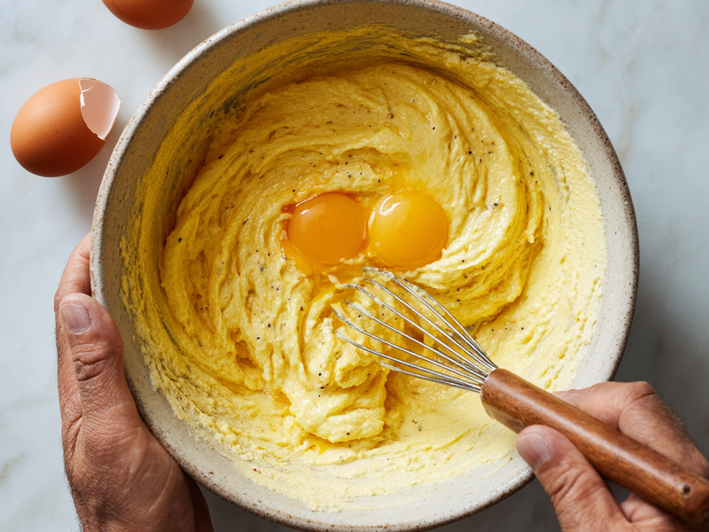 Step 5: Add the eggs one at a time, mixing on low speed. Scrape the sides of the bowl as needed so the mixture stays even.